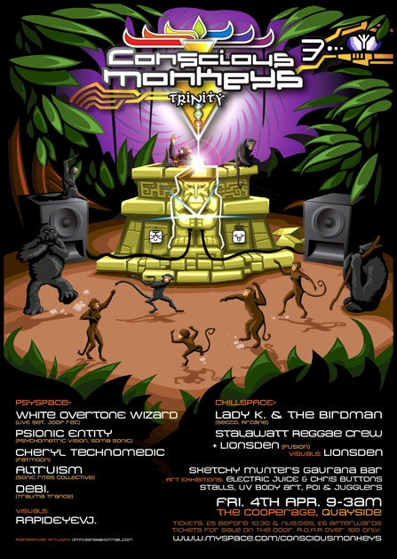 We are a new psytrance and the only psytrance night at the moment in Newcastle so do come along to support and play in what will hopefully be a bright future for Conscious Monkeys events here.