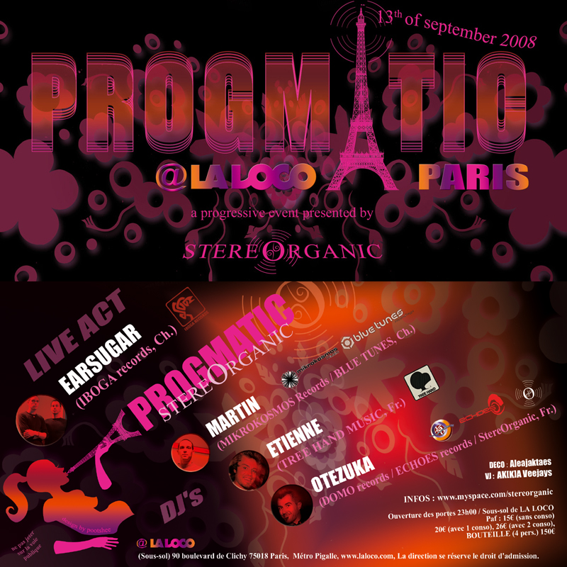 http://maps.google.fr/maps?f=q&hl=fr&q=90+Boulevard+de+Clichy,+75018+Paris,+Paris,+Ile-de-France,+France&sll=47.15984,2.988281&sspn=13.195025,31.662598&ie=UTF8&cd=1&geocode=FTfp6QIdZJYjAA&z=16&iwloc=addrStereOrganic présente : PROGMATIC Samedi 13 September 2008 LIVE ACT EARSUGAR (IBOGA records, Ch.) Earsugar est le nouveau projet Trance Progressive très plébiscité de Nicola Capobianco alias LIQUID SOUL et DJ Martin. Ils ont signé des morceaux chez Plusquam, Hommega, Mikrokosmos, Domo et Blue Tunes records. Ils viennent pour la 1ère fois en France et nous offrirons tous les nouveaux tracks disponibles très prochainement chez IBOGA records. Very groovy! www.myspace.com/earsugar www.iboga-records.dk DJ's MARTIN (MIKROKOSMOS Records / BLUE TUNES, Ch.) DJ Martin a commencé à tourner dans les clubs à Zürich autour de 1998. Il a collaboré avec des artistes comme Tobias Wirz (Greed), Andre Absolut, Kasey Taylor, Cafu et Nicola de Liquid Soul depuis 2004 sur le projet Earsugar. Son interprétation de la trance progressive a fait de lui un dj et producteur unique. Ses sets sont toujours très puissants et hypnotiques. Get ready! www.myspace.com/djmartinmikrokosmos www.mikrokosmos-records.ch ETIENNE (TREE HAND MUSIC, Fr.) Etienne aka Senix est un dj international apprécié depuis de nombreuses années. Chacune de ses performances se distingue par de grandes qualités techniques et un choix musical éclectique. Etienne nous envoutera de sonorités deep sexy et mélogroove. Be sexy! www.myspace.com/senix & www.treehandmusic.com OTEZUKA (DOMO records / ECHOES records / StereOrganic, Fr.) Après Bim Bam Boom et tout dernièrement les soirées Odditorium, Rémy alias Otezuka (membre fondateur de StereOrganic et Dj pour les labels israéliens Domo et Echoes records) entame une nouvelle résidence à la Locomotive (un des clubs mythiques de Paris) avec les soirées Progmatic et Kooler. Il viendra jouer ses dernières acquisitions musicales 100% Progressives. Never stop until you drop! www.myspace.com/otezuka www.myspace.com/stereorganic www.myspace.com/domorec www.myspace.com/echoesrecords DECO : Aleajaktaes VJ : AK[K]A Veejays INFOS : www.myspace.com/stereorganic www.laloco.com Ouverture des portes 23h00 / Sous-sol de LA LOCO Paf : 15€ (sans conso) 20€ (avec 1 conso), 26€ (avec 2 conso), BOUTEILLE (4 pers.) 150€ LIEU : LA LOCO au Sous-Sol 90 boulevard de Clichy 75018 Paris Métro Pigalle/Blanche
